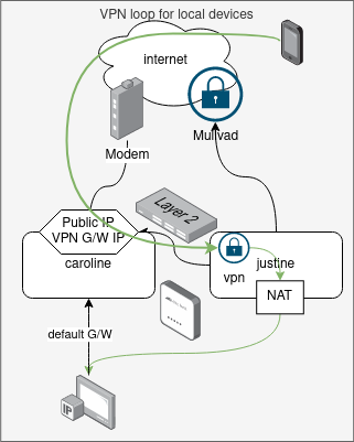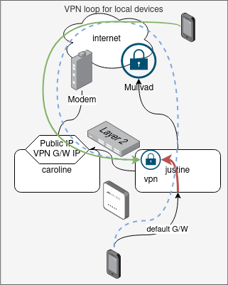 This entry will capture attempt from devices that route via justine (default G/W 192.168.1.2) to justine to prevent traffic going out to Mullvad and comming back to caroline and down to justine.